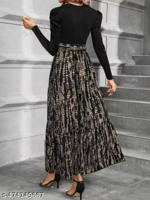 Name : Clasi Women's Autumn Dress With Bow Tie Belt, Leaf & Floral Patchwork A-Line Skirt Maxi Women Outfit