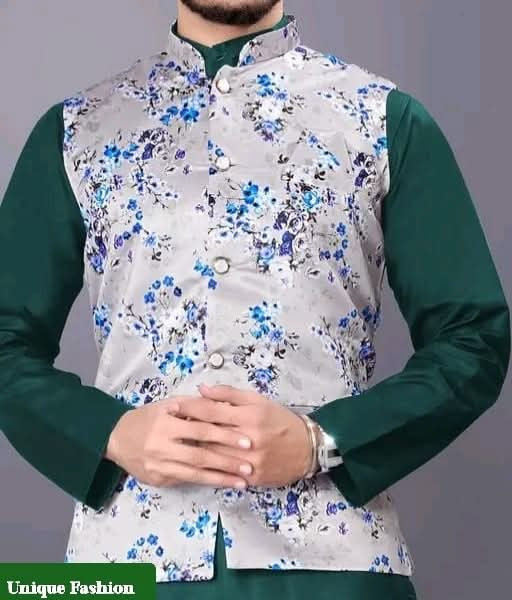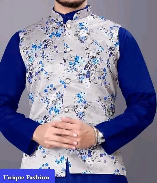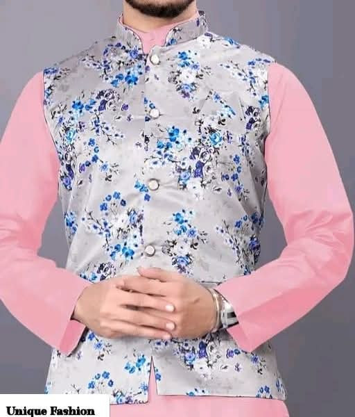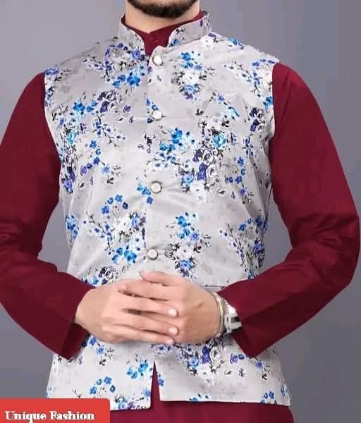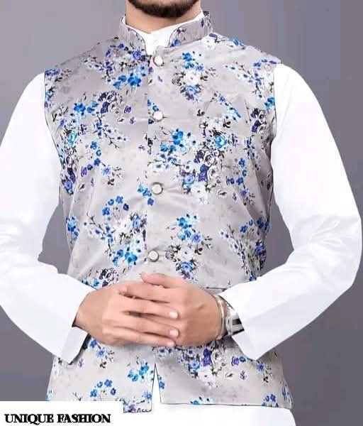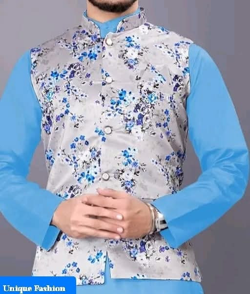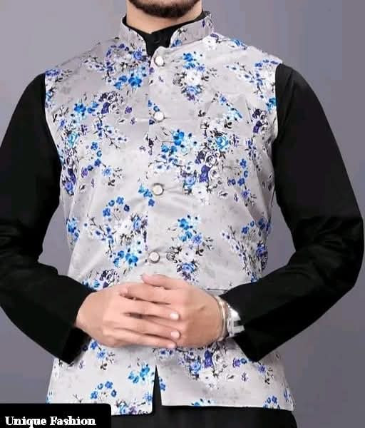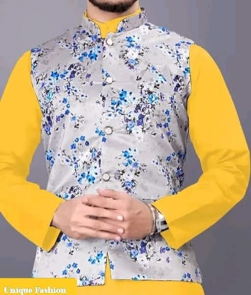 Elevate your traditional wear with this stylish Men\"s Nehru Jacket! ? Featuring a striking grey base with vibrant blue floral patterns, this waistcoat perfectly layers over a solid-colored kurta. Choose from various combinations like classic black ?, crisp white ?, bright yellow ☀️, or rich maroon ?. It’s the ideal outfit for a wedding, festive event, or any occasion where you want to make a unique fashion statement! ✨